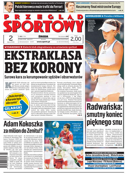 Korona Kielce zdegradowana z ekstraklasy po aferze korupcyjnej; Agnieszka Radwańska przegrała z Sereną Williams; Adam Kokoszka może zagrać w Zenicie St. Petersburg; fuzja Polonii i Groclinu; szef UEFA przyjeżdża na inspekcję do Warszawy; Jewgienij Łukanienko skoczył o tyczce 6,01 m podczas Europejskiego Festiwalu Lekkoatletycznego w Bydgoszczy.