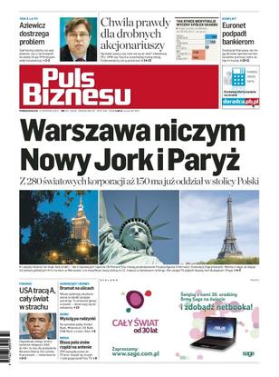 Z 280 światowych korporacji aż 150 ma już oddział w Warszawie; instytucje bankowe nie mogą darować operatorowi bankomatów Euronet promocji, która nabija im koszty; miasta opóźniają odszkodowania za działki przejęte pod drogi; czołowe spożywcze sklepy internetowe odnotowały w zeszłym roku wzrost o 40%; jesienią na sprzedaż pójdą: Kredyt Bank, Bank Millennium, DZ Bank, DNB Nord i być może Alior Bank; zaostrzając prawo, resort finansów sprawił, że kasyna nie muszą już rejestrować swoich klientów; po raz pierwszy dług USA stracił najwyższą ocenę wiarygodności.