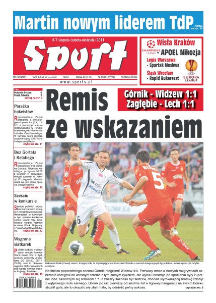 Daniel Martin został nowy liderem Tour de Pologne; mimo pokładanych nadziei Górnik Zabrze zremisował z Widzewem Łódź 1-1; reprezentacja Polski w hokeju przegrała z Metalurgiem Lipawa 1-4; reprezentacja Polski koszykarzy, bez Marcina Gortata i Thomasa Kelatiego, przegrała 58-65 z Izraelem; sześciu polskich skoczków narciarskich wystąpi w niedzielę w niemieckim Hinterzarten w czwartym w tym sezonie konkursie Letniej Grand Prix; polskie siatkarki w pierwszym meczu turnieju World Grand Prix w Bydgoszczy pokonały drużynę Argentyny 3-0.