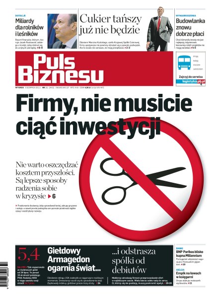 Firmom nie opłaca się oszczędzać kosztem przyszłości, mają lepsze sposoby radzenia sobie w kryzysie; resort finansów, którym kieruje Jacek Rostowski, zabiega o kredyt, żeby dobrać się do unijnych pieniędzy; zdaniem Marcina Kulickiego, szefa Krajowej Spółki Cukrowej, firmy spożywcze nie powinny denerwować się z powodu podwyżek; obniżenie ratingu USA nadeszło w najgorszym możliwym momencie, inwestorzy rzucili się do sprzedawania akcji.
