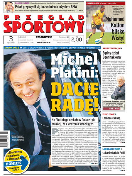 Michel Platini optymistycznie ocenia szanse Polski w przygotowaniach do Euro 2012; zarząd PZPN spotka się z Leo Beenhakkerem, by podsumować występ reprezentacji; Mohamed Kallon może trafić do Wisły Kraków; Bud Collins ocenia grę Agnieszki Radwańskiej; wywiad z Jewgienijem Łukianienką; czy główny inżynier BMW Sauber odszedł po krytycznych uwagach Roberta Kubicy?