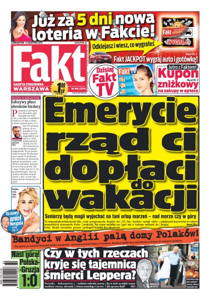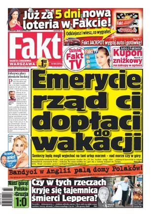 Wspaniałą wiadomość dla wszystkich starszych Polaków – rząd dopłaci za wypoczynek emeryta; bandyci w Anglii palą domy spokojnych Polaków; jakie tajemnice kryje za sobą śmierć Andrzeja Leppera – gdzie można szukać odpowiedzi na związane z nią pytania; jak wygląda nowa dziewczyna Nergala; Polska pokonała Gruzję 1:0, jedyną bramkę meczu zdobył Jakub Błąszczykowski.
