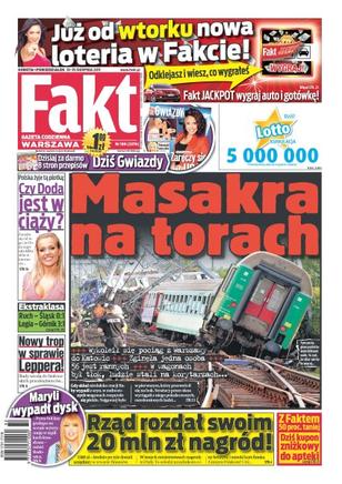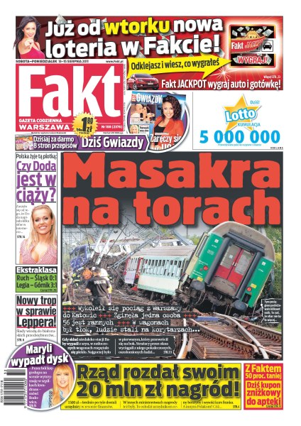 Wykoleił się pociąg z Warszawy do Krakowa; urzędnicy w resorcie finansów dostali po 1500 zł nagrody; czy Doda jest w ciąży; śledczy badają białoruski trop w sprawie samobójstwa Andrzeja Leppera; ojciec Tadeusz Rydzyk chce zbudować w Toruniu aquapark i SPA; sekretarz generalny PZPN został wyproszony z pokładu samolotu linii Wrocław-Warszawa.