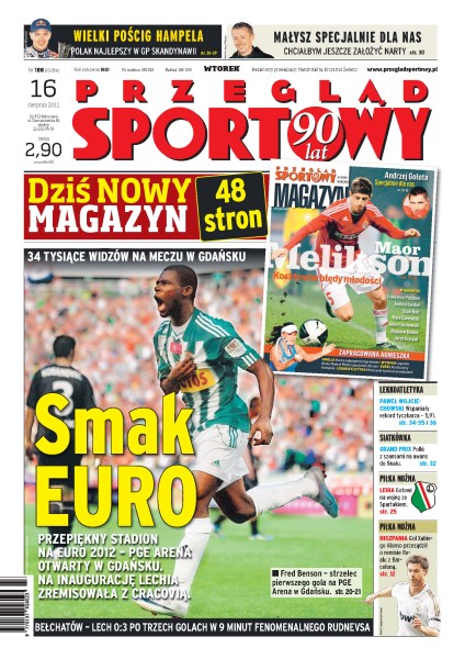 Na inaugurację pięknego stadionu na EURO 2012 – PGE ARENA w Gdańsku Lechia zremisowała z Cracovią; Jarosław Hampel wygrał żużlowe Grand Prix Skandynawii; Adam Małysz otwarcie przyznaje, że chciałby jeszcze założyć narty; gol Xabiego Alonso przesądził o remisie Realu z Barceloną; Legia Warszawa jest gotowa do wojny ze Spartakiem; tyczkarz Paweł Wojciechowski zaliczył wspaniały rekord – 5,91 metra; obszerny wywiad z Andrzejem Gołotą.