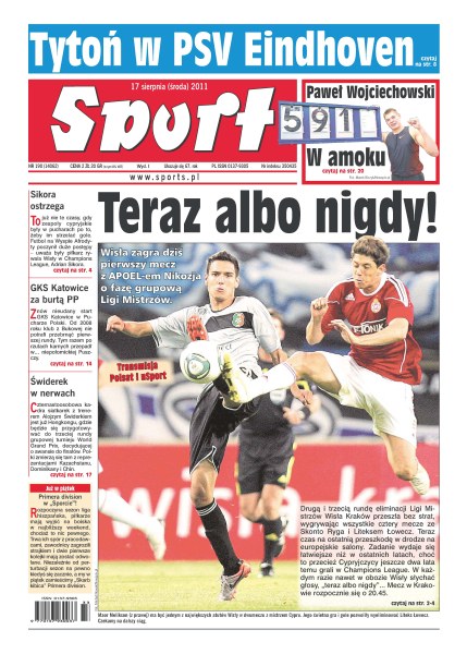 Wisła zagra dziś pierwszy mecz z APOEL-em Nikozja o fazę grupową Ligi Mistrzów; dziś na Camp Nou rozegrany zostanie rewanżowy mecz o Superpuchar Hiszpanii między FC Barceloną i Realem Madryt; wciąż nie wiadomo, która z polskich telewizji pokaże pojedynek Tomasza Adamka z Witalijem Kliczką; w Szeged rozpoczynają się mistrzostwa świata w kajakarstwie, wystąpi na nich 29 reprezentantów Polski; Paweł Wojciechowski poprawił 23-letni rekord Polski w skoku o tyczce.