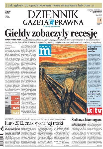 Inwestorzy drżą przed groźbą spowolnienia – w czwartek rynkami rządziły fatalne dane z USA, w Polsce do wyprzedaży dołożyły się informacje o ostrym hamowaniu produkcji przemysłowej; jak zgłosić do opodatkowania nowe mieszkanie lub dom; każde użycie nazwy „Euro 2012” do celów komercyjnych bez zgody i wiedzy UEFA może zostać uznane za bezprawne; gminy blokują tworzenie prywatnych żłobków, bo z powodu braku pieniędzy chcą zaoszczędzić na dotacjach.