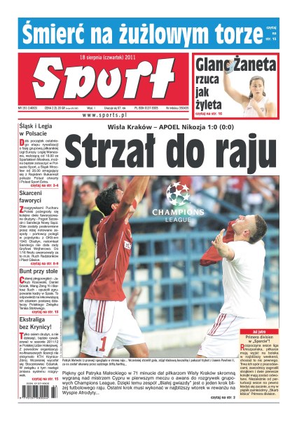 Wisła Kraków pokonała APOEL Nikozję i jest coraz bliżej awansu do Ligi Mistrzów; Legia Warszawa zagra dziś ze Spartakiem Moskwa, a Śląsk Wrocław z Rapidem Bukareszt o fazę grupową Ligi Europy; czterej pingpongiści w proteście opuścili zgrupowanie kadry w Spale; tylko osiem drużyn będzie rywalizować w sezonie 2011/12 w Polskiej Lidze Hokejowej; Caroline Wozniacki odpadła w drugiej rundzie tenisowego turnieju WTA Tour rangi Premier I w Cincinnati; Żaneta Glanc w dysku i Paweł Fajdek w rzucie młotem zdobyli złote medale Uniwersjady w chińskim Shenzhen.