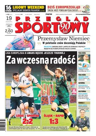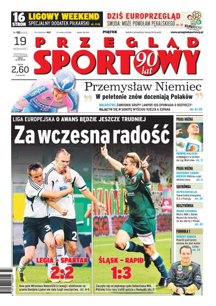 Śląsk Wrocław i Legia Warszawa staną w przyszłym tygodniu przed bardzo trudnymi wyzwaniami – czy po dzisiejszych nieudanych spotkaniach uda im się awansować do Ligi Europejskiej; przedmeczowe analizy spotkań czwartej kolejki piłkarskiej ekstraklasy; Przemysław Niemiec opowiada o rozpoczynającym się w sobotę wyścigu Vuelta A Espana; Patryk Małecki opowiada o emocjach, które towarzyszą walce o Ligę Mistrzów.