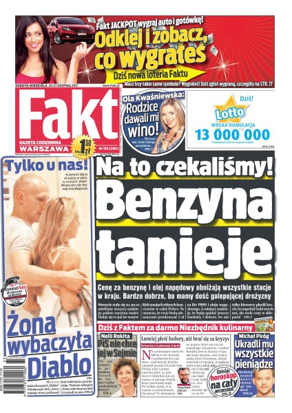 Wszystkie stacje w kraju obniżają ceny za benzynę i olej napędowy; opozycja mocno atakuje rząd za to, że nic nie robi, w odpowiedzi Donald Tusk oskarża lidera PiS o tchórzostwo; minister zdrowia obiecuje, że kolejki do lekarz będą znacznie krótsze; szczere wyznania Oli Kwaśniewskiej; Krzysztof Włodarczyk wraca do psychicznej stabilności.
