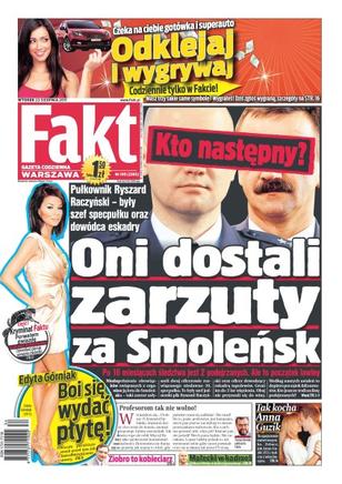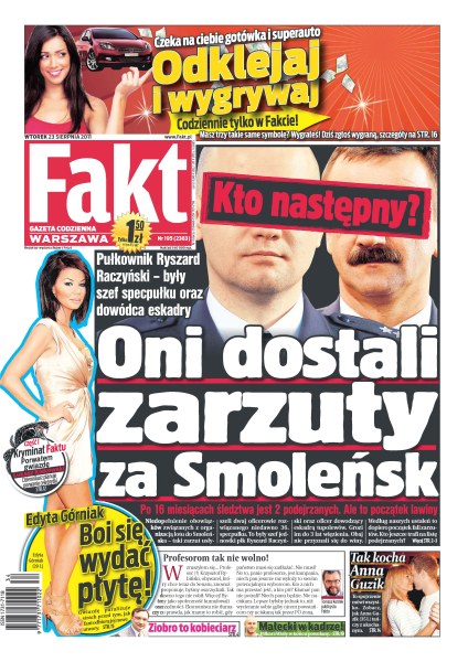 Pułkownik Ryszard Raczyński – były szef specpułku oraz dowódca eskadry usłyszeli jako pierwsi zarzuty dotyczące katastrofy smoleńskiej; czy Zbigniew Ziobro to kobieciarz; dlaczego Edyta Górniak boi się wydać płytę; Piotr Gąsowski lansuje się na skuterze; Natalia Lesz się zaręczyła; Daniel Mąka urządził balangę w szatni; w Legii wszystkim puszczają nerwy; Robert Kubica może trenować w Ferrari; rebelianci zdobyli Trypolis, a libijski dyktator ukrył się w bunkrze.