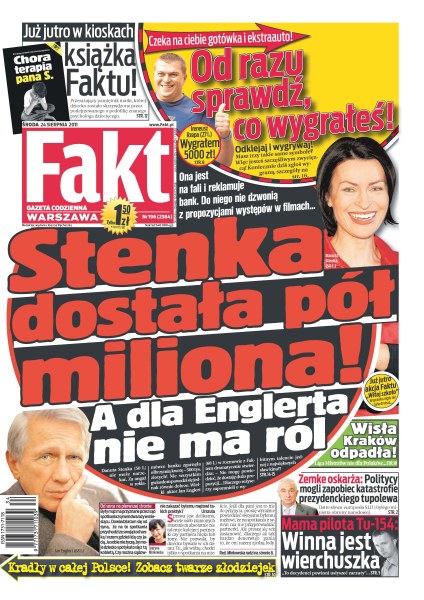 Schetyna i nowy szef Ministerstwa Obrony Narodowej Tomasz Siemoniak spotkali się na obiedzie; Danuta Stenka za reklamę banku zgarnęła 500 000 złotych; Natasza Urbańska podbija Amerykę; Mistrz Polski nie awansował do Ligi Mistrzów; jak Legia pławi się w luksusach.