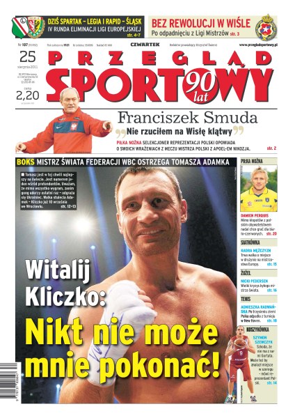 Walka stulecia Adamek – Kliczko już 10 września we Wrocławiu; mimo klęski w Nikozji przynajmniej w najbliższym czasie nie będzie rewolucji przy Reymonta; przed drugim spotkaniem IV rundy eliminacji Ligi Europejskiej Rosjanie są pewni siebie, Polacy chcą pokrzyżować im plany; 3 mln euro może dostać polski zespół od UEFA za grę w fazie grupowej – właśnie tyle zarobił Lech; trener Andrea Anastasi kończy selekcję przed mistrzostwami Europy; Agnieszka Radwańska znów uległa Petrze Cetkovskiej i odpadła w drugiej rundzie turnieju w New Haven.
