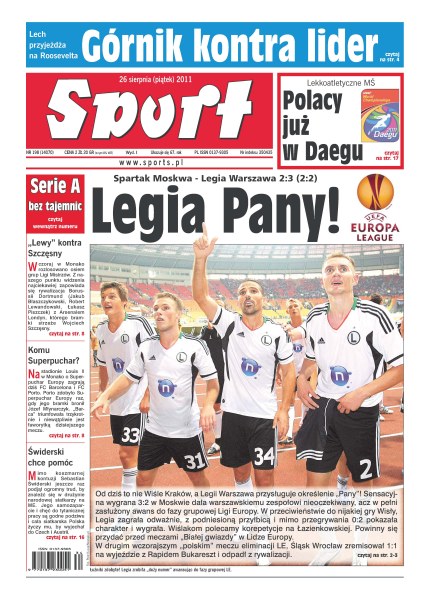 Sensacyjna wygrana 3:2 w Moskwie dała nieoczekiwany, acz w pełni zasłużony awans do fazy grupowej Ligi Europy; hitem fazy grupowej Ligi Mistrzów będą z pewnością spotkania broniącej trofeum Barcelony z mistrzem Włoch, Milanem; mecz z udziałem Artura Boruca miał otworzyć nowy sezon w Serie A, ale piłkarze zapowiedzieli strajk; Łukasz Kubot zrezygnował z występu w US Open; popularny „Świder” jest gotowy, by wraz z reprezentacją powalczyć o obronę mistrzostwa Europy – teraz czeka na decyzję Andrei Anastasiego.