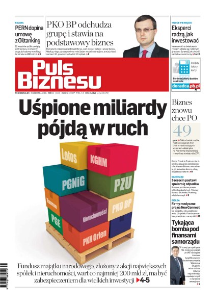 PERN dopina umowę z Oiltanking, która otworzy drogę do budowy morskiego terminalu za 800 mln zł; PKO BP odchudza grupę i stawia na podstawowy biznes; eksperci radzą, jak inwestować, by uchronić kapitał w czasie burzy; 49 procent szefów małych i średnich firm chce w nadchodzących wyborach oddać głos na Platformę Obywatelską; Szczecin postawi spalarnię odpadów; firmy medyczne na NewConnect – od początku roku zadebiutowało 13 spółek; fundusz majątku narodowego, wart co najmniej 200 mld zł, ma być zabezpieczeniem dla wielkich inwestycji.