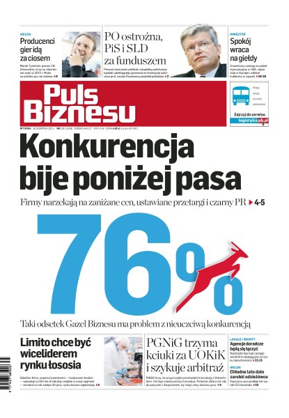 Konkurencja bije poniżej pasa – firmy narzekają na zaniżanie cen, ustawiane przetargi i czarny PR; producenci gier idą za ciosem – Marek Tymiński, prezes City Interactive, liczy na rekordowe zyski w 2012 roku; pomysł stworzenia wehikułu skupiającego państwowy kapitał udzielającego gwarancji na inwestycje autorstwa prof. Leszka Pawłowicza podzielił polityków; spokój wraca na giełdy; Limito chce być wiceliderem na rynku łososia; PGNiG trzyma kciuki za UOKiK i szykuje arbitraż; agencje doradcze będą się łączyć; chłodne lato dało zarobić odzieżówce.