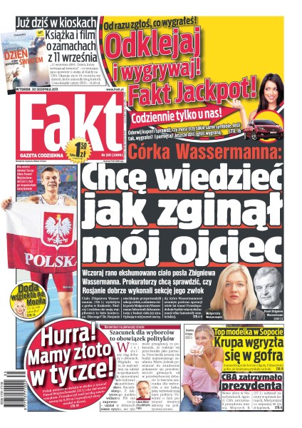 Wczoraj rano ekshumowano ciało posła Zbigniewa Wassermanna – prokuratorzy chcą sprawdzić, czy Rosjanie dobrze wykonali sekcję jego zwłok; Polak mistrzem świata w skoku o tyczce - Paweł Wojciechowski nie dał szans rywalom; Top modelka w Sopocie – Krupa wgryzła się w gofra; CBA zatrzymało prezydenta Starachowic; Doda wściekła na Mozila.