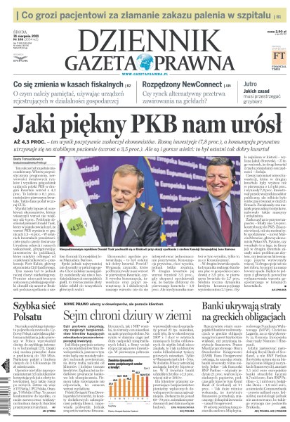 PKB Polski urósł o 4,3 procent, niestety to ostatni tak dobry kwartał; co grozi pacjentowi za złamanie zakazu palenia w szpitalu; co się zmienia w kasach fiskalnych; rozpędzony NewConnect – czy przetrwa zawirowania na giełdach; Cyfrowy Polsat jako pierwszy w Polsce wprowadził dostęp do szybkiego internetu w technologii LTE; Sejm chroni dziury w ziemi – nowe prawo uderzy w deweloperów, ale pomoże klientom; banki ukrywają straty na greckich obligacjach.