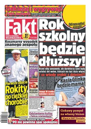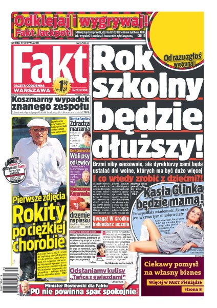 Rok szkolny będzie dłuższy – dyrektorzy sami będą ustalać dni wolne; Kasia Glinka będzie mamą; pierwsze zdjęcia Jana Rokity po ciężkiej chorobie; koszmarny wypadek zespołu Oddział Zamknięty; Fakt odsłania kulisy „Tańca z gwiazdami”; „PO nie powinna spać spokojnie” – minister Rostowski; Aleksander Kwaśniewski woli psy od lewicy; Dorota Gardias zdradza marzenia.
