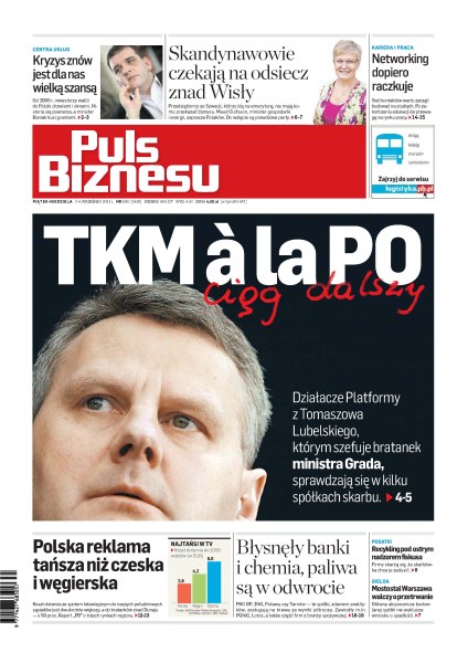 Działacze Platformy z Tomaszowa Lubelskiego, którym szefuje bratanek ministra Grada, sprawdzają się w kilku spółkach skarbu; kryzys znów jest dla Polski wielką szansą; Skandynawowie czekają na odsiecz znad Wisły; networking dopiero raczkuje; polska reklama tańsza niż czeska i węgierska; błysnęły banki i chemia, paliwa są w odwrocie; recykling pod ostrym nadzorem fiskusa; Mostostal Warszawa walczy o przetrwanie.