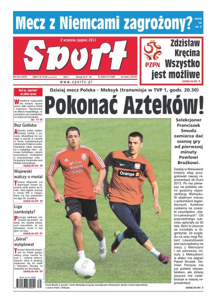 Pokonać Azteków – dzisiaj mecz Polska-Meksyk; mecz z Niemcami zagrożony; „wszystko jest możliwe” – Zdzisław Kręcina; aktualny mistrz świata, Tomasz Gollob, z powodu rehabilitacji nie wystąpi w sobotę w Lesznie; Tomasz Majewski walczy o medal; PlusLiga siatkarzy całkowicie się zmieni; Tomasz Adamek przyleciał do Polski i został gorąco powitany przez swoich fanów.