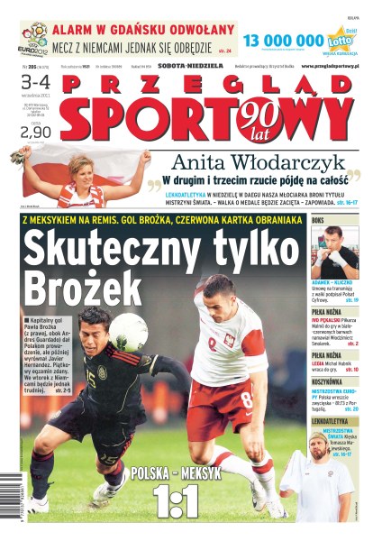 Polska zremisowała z Meksykiem 1:1; we wtorek gramy z finalistami EURO 2012 – piłkarze Joachima Löwa wygrali osiem razy i już awansowali; przyśpiewki o piecach i Auschwitz to największa wizerunkowa kompromitacja Śląska od powrotu do ekstraklasy; Tomasz Majewski nie zakwalifikował się do ścisłego finału, mistrzem został David Storl; w sobotę Jamajczyk Usain Bolt pobiegnie po pierwszy złoty medal mistrzostw świata w Daegu; Cyfrowy Polsat podpisał umowę na walkę Adamek – Kliczko; Polska pokonała Portugalię 81:73 w trzecim meczu mistrzostw Europy.