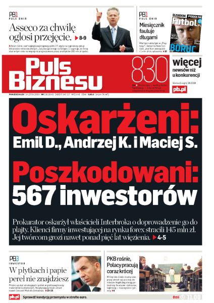 Oskarżenie przeciwko twórcom Interbroka; przeciętny czas pracy w popularnych zawodach; szykuje się walka o udziały Casinos Poland; Futbol.p bliski bankructwa; branża dnia: materiały budowlane.