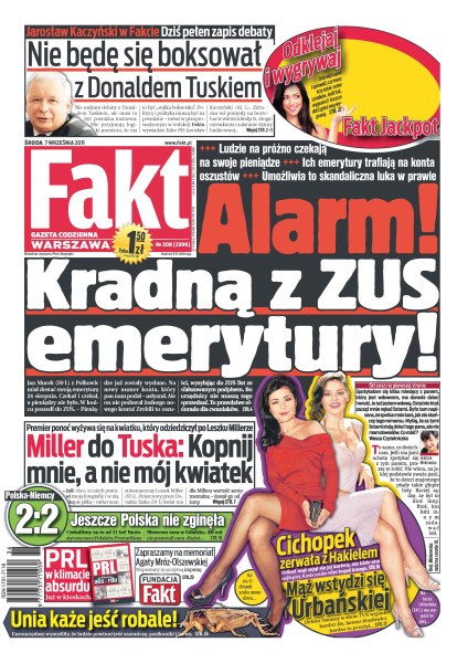 Jarosław Kaczyński udzielił wywiadu w redakcji Faktu; oszuści kradną emerytury z ZUS; Donald Tusk zniszczył kwiatek, który odziedziczył po Leszku Millerze; Polacy zremisowali w Gdańsku z Niemcami 2:2; żona Tomasza Adamka wspiera go przed walką z Witalijem Kliczką; czy Zbigniew Chlebowski wróci do PO; Ramona, suczka Kory, zatruła się wołowiną; do warszawskiego zoo podrzucono krokodyla nilowego.