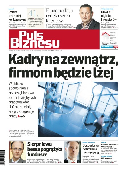 Sprzedaż napojów Frugo po dwóch miesiącach przekroczyła 32 mln zł, kolejne mają pojawić się lody i guma do żucia; Polska zajmuje 41. miejsce w rankingu konkurencyjności World Economic Forum; po dobrych informacjach z największych gospodarek poprawiła się sytuacja na światowych giełdach; w obliczu spowolnienia przedsiębiorstwa zatrudniają byłych pracowników – nie na etat, ale przez agencje pracy; PKP chce sprzedać działki w centrum Warszawy.