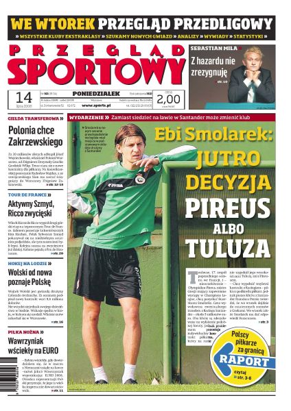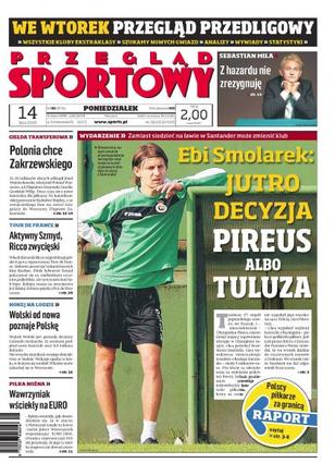 Olympiakos Pireus chce pozyskać Smolarka; w zagranicznych klubach cenią polskich bramkarzy; Polonia chce kupić Zakrzewskiego; Wawrzyniak jest niedowartościowany występem na Euro 2008; Sebastian Mila widzi w Śląsku perspektywy dla swojej kariery; wywiad z hokeistą Wojciechem Wolskim; Lozano zna już skład na olimpiadę; Ricco pierwszy w kolejnym etapie Tour de France.