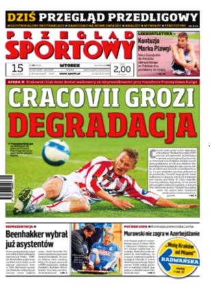 Cracovi grozi degradacja za nieprawidłowości w transferze Kuliga; Leo Beenhakker wybrał już nowy sztab; Rafał Murawski nie zgra z Azerbejdżanem; Agnieszka Radwańska woli Kraków niż Florydę; Marek Plawgo uległ kontuzji; Cadel Evans jest od wczoraj nowym liderem Tour de France; Kubica lubi tory w Niemczech i na Węgrzech; na mistrzostwach świata w pływaniu w Meksyku polscy juniorzy zdobyli sześć medali.