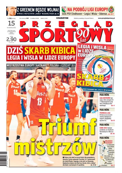 Polscy siatkarze wygrali z Czechami i zakwalifikowali się do ćwierćfinałów Mistrzostw Europy; rozmowa z Orestem Lenczykiem, trenerem Śląska Wrocław; rozmowa z Krzysztofem Włodarczykiem, mistrzem świata WBC; w rozgrywkach polskiej 1. ligi Zawisza Bydgoszcz pokonała Bogdankę Łęczną; trwają przygotowania do meczu PSV Eindhoven – Legia Warszawa.