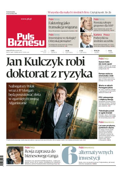 Jan Kulczyk wraz z JP Morgan będą poszukiwać złota w ogarniętym wojną Afganistanie; faktoring jako transakcja wiązana; w październiku można starać się o dotację na certyfikat środowiskowy; ruszają zakupy grupowe dla MSP; Maciej Dubis zapowiada, że w 2012 roku wzrost płac przegoni inflację; Sunset Suits nie może upaść; Europa wytycza emerytalny szlak; Warta w rękach Portugalczyków; PZU zainwestuje z większą finezją; starzenie się społeczeństw będzie równoważne z osłabieniem rynków akcji wg amerykańskich specjalistów; Rosja zaprasza do biznesowego tanga; sześć alternatywnych inwestycji.