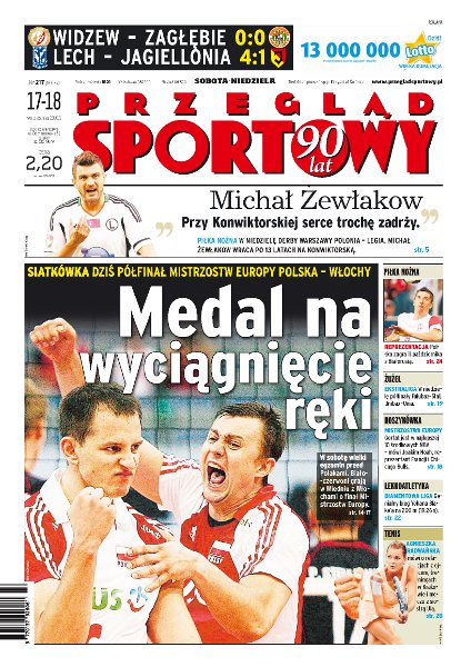 Medal na wyciągnięcie ręki: dziś Polska gra z Włochami w półfinale mistrzostw Europy w siatkówce; w niedzielę derby Polonia – Legia, Żewłakow wraca po 13 latach na Konwiktorską; reprezentacja piłkarska zagra 11 października z Białorusią; w niedzielę półfinały ekstraligi żużlowej; mistrzostwa Europy w koszykówce dobiegają końca; Diamentowa Liga: genialny bieg Yohana Blake'a na 200 m; Agnieszka Radwańska mówi o relacjach z ojcem, treningach w Krakowie i meczu z siostrą Urszulą; Lech – Jagiellonia: Rudniew strzelił trzeciego hat tricka w tym sezonie; Widzew zremisował z Zagłębiem; w Anglii starcie Manchesteru United z Chelsea Londyn; Joakim Noah, środkowy reprezentacji Francji, twierdzi, że Marcin Gortat jest jednym z 10 najlepszych środkowych w NBA; w ekstralidze żużlowej są już półfinały.