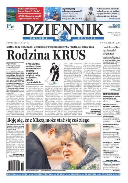 Prezes KRUS zatrudnia swoich krewnych i przyjaciół; batalia o prywatyzację szpitali; Kwaśniewski popiera budowę Gazociągu Północnego; robotnicy z Niemiec pracują za mniej niż Polacy; nastał sezon na anoreksję; sprowadzamy z zachodu coraz więcej aut; Paweł Śpiewak- polską tradycją jest liberalizm; rozmowa z Mariną Chodorkowską; w Rosji rośnie kult dynastii Romanowów; dziś Legia i Lech rozegrają mecze pierwszej rundy kwalifikacyjnej. Dodatki: The Wall Street Journal, Warszawa