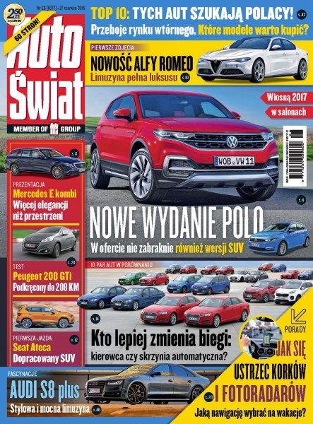 Volkswageny Polo i T-Roc – nowe modele segmentu B; Mercedes klasy E model T – pierwsza jazda nowym kombi klasy wyższej; aktualności ze świata motoryzacji; Seat Ateca – wrażenia z jazd pierwszym hiszpańskim SUV-em; porównanie aut z manualną i automatyczną skrzynią biegów; które auta łatwo ukraść – mamy wyniki te-stów wykonanych przez specjalistów ADAC; chcesz kupić Hyundaia i20 z drugiej ręki – poradzimy ci, którą wersję wybrać.