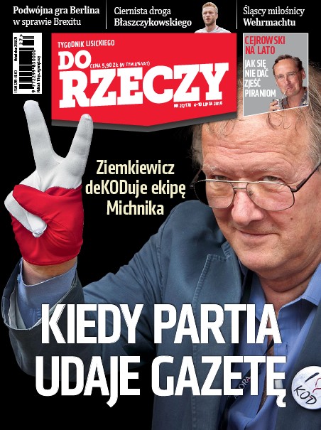 „Gazeta Wyborcza”, odrzucając pozory i otwarcie angażując się w walkę z PiS, bardziej dziś przypomina ugrupowanie polityczne niż media; podwójna gra Berlina: wywiad z wiceprzewodniczącym Parlamentu Europejskiego, politykiem PiS, Ryszardem Czarneckim; droga do sławy Jakuba Błaszczykowskiego; Wehrmacht – w ciągu kilku lat stał się w przekazie historycznym już nie wojskiem zła, lecz normalną siłą zbrojną, w której służba nie przynosi z całą pewnością ujmy, ale jest wręcz zaszczytem.