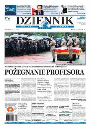 Pożegnanie Bronisława Geremka, w ABW istniała komórka zajmująca się inwigilacją na potrzeby kontrwywiadu, bez przełomu w sprawie tarczy po spotkaniu Radosława Sikorskiego z Danielem Friedem, Radio Maryja bezprawnie zbiera datki na odwierty geologiczne w Toruniu, ofensywa Niemiec w unijnej polityce wschodniej, żywność zdrożała o 7,6%, ale pensje o 12%, chiński Great Wall Motors chce sprzedawać w Polsce auta terenowe. Dodatki: The Wall Street Journal Polska, Warszawa, Nieruchomości.