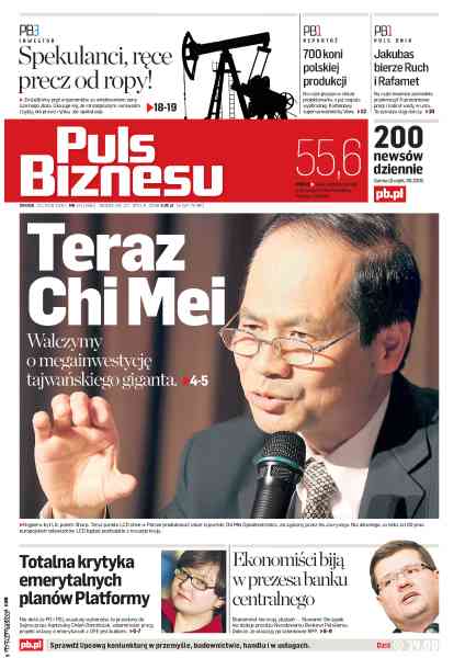 Tajwański producent monitorów LCD Chi Mei zastanawia się nad inwestycją w Gryfinie pod Szczecinem, rządowy projekt ustawy emerytalnej wbrew wcześniejszym obietnicom nie przewiduje emerytur małżeńskich, ekonomiści biorą pod lupę prezesurę Sławomira Skrzypka, Media Point Group sprzedał połowę oferowanych akcji, za rekordowe ceny ropy odpowiedzialni są spekulanci, korekta na GPW może się utrzymać.