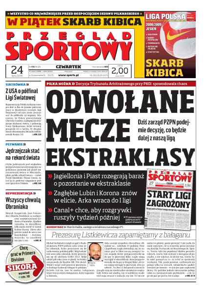 Kompletny chaos po decyzji Trybunału Arbitrażowego przy PZPN - start ligi jest poważnie zagrożony, opinie działaczy i publicystów o sytuacji w ekstraklasie, Inakim Descarga już w Legii, Formuła 1: zasada działania systemów hybrydowych KERS, polscy siatkarze zagrają dziś z Amerykanami w turnieju Ligi Światowej, Carlos Sastre i CSC zmiażdżyli rywali na królewskim etapie TdF.