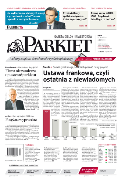 Największy w Polsce newsroom gospodarczy zbiera, analizuje i zgłębia dla Państwa najważniejsze informacje ze świata finansów. Codzienne wydanie „Parkietu”, sześć dni w tygodniu, to kilkadziesiąt artykułów o emitentach, instytucjach finansowych, gospodarce. To również opinie, felietony i wywiady z najważniejszymi ludźmi krajowej i globalnej finansjery.