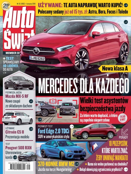Mercedes klasy A – następna generacja w 2018, co się zmieni; Audi A4 Allroad – wrażenia z jazd nowym uterenowionym kombi; Mazda MX-5 RF – pierwsza jazda MX-5 z twardym dachem; Porsche Panamera – najważniejsze zmiany w nowej generacji auta; Audi Q7, BMW serii 7, Hyundai Tucson, Mazda CX-5, Skoda Fabia, VW Tiguan – test systemów asystujących; Peugeot 508 RXH – duży crossover z dieslem 2.0 (180 KM); Ford Edge – pierwszy test nowego SUV-a; Smart Fortwo cabrio – miejski maluch ze składanym dachem.