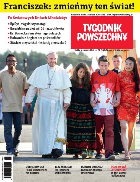 Po Światowych Dniach Młodzieży - Bp Ryś: ciąg dalszy nastąpi, Bargielska: papież wśród naszych lęków, ks. Boniecki: sens słów najprostszych, Hołownia: z Bogiem bez pośredników, Stasiuk: przyszłości nie da się przeczekać; olimpiada w Rio de Janeiro: zasłona dymna dla konfliktów społecznych; 1 sierpnia: co się stało z polską pamięcią; rozmowa z rysownikiem Bohdanem Butenką.