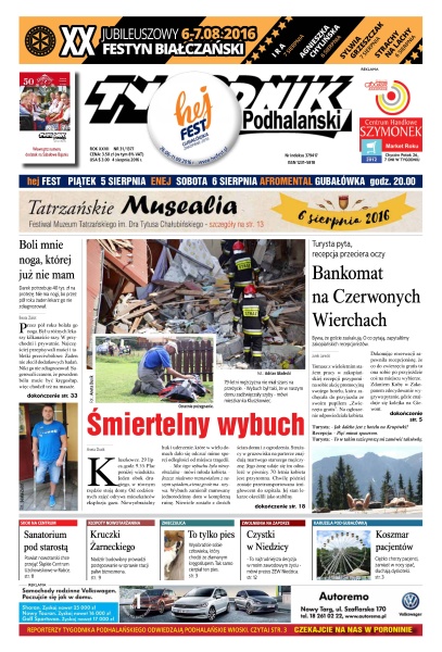 Śmiertelny wybuch – 79-letni mężczyzna nie miał szans na przeżycie - wybuch był taki, że w naszym domu zadźwięczały szyby - mówi mieszkanka Kluszkowiec; boli mnie noga, której już nie mam – Darek potrzebuje 40 tys. zł na protezę. Nie ma nogi, bo przez pół roku żaden lekarz go nie zdiagnozował; bankomat na Czerwonych Wierchach – turysta pyta, recepcja przeciera oczy; powiat nowotarski chce przejąć Śląskie Centrum Uzdrowiskowe w Rabce; kruczki Żarneckiego – nadzór budowlany prowadzi postępowanie w sprawie stacji paliw biznesmena.