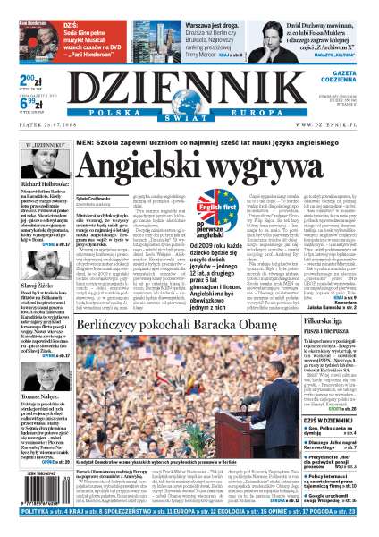 MEN obiecuje co najmniej sześć lat nauki angielskiego w szkołach, Barack Obama wzbudził zachwyt w Niemczech, Roman Polko czeka na dymisję, "Dziennik" przygląda się działalności sopockiego biznesmena Sławomira Julkego, życie w Warszawie jest droższe niż w Berlinie lub Brukseli, z Komendy Głównej Policji wyciekają dane internautów, sport: przełożony start ekstraklasy.