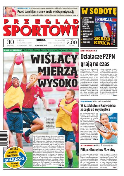 Awans do trzeciej rundy eliminacji do Ligi Mistrzów jest zadaniem, które Wisła Kraków i jej trener po prostu muszą wykonać; Toto Tamuz - największy talent w izraelskiej piłce nożnej; Piotr Świerczewski został w areszcie i grozi mu kara pięciu lat więzienia, Radosław Majewski wyszedł za kaucją; 10 ważnych pytań do PZPN; kulomiot Tomasz Majewski wygrał Super Grand Prix w Monako; Marco Bonitta mówi, że igrzyska w Pekinie będą prawdopodobnie ostatnimi w jego trenerskiej karierze.