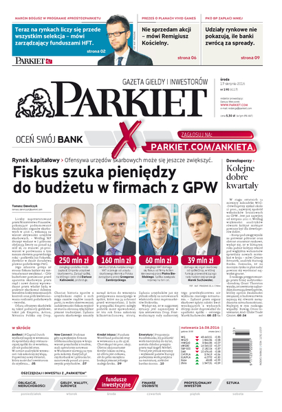 Największy w Polsce newsroom gospodarczy zbiera, analizuje i zgłębia dla Państwa najważniejsze informacje ze świata finansów. Codzienne wydanie „Parkietu”, sześć dni w tygodniu, to kilkadziesiąt artykułów o emitentach, instytucjach finansowych, gospodarce. To również opinie, felietony i wywiady z najważniejszymi ludźmi krajowej i globalnej finansjery.