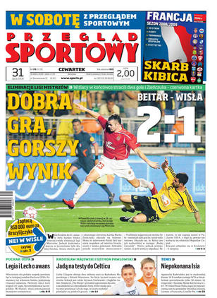 Wisła przegrała spotkanie z Beitarem 2:1; masowa ucieczka piłkarzy z Korony Kielce; Celtic jest zainteresowany transferami Radosława Majewskiego i Szymona Pawłowskiego; podsumowanie osiągnięć Bogdana Wenty po czterech latach prowadzenia kadry; Lidia Chojecka w ostatniej próbie zakwalifikowała się na igrzyska olimpijskie; 30 tysięcy Polaków wyrusza do Budapesztu obejrzeć Roberta Kubicę.