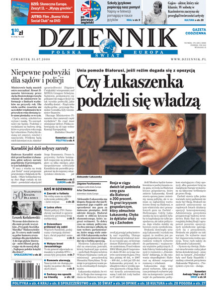 Radovan Karadżić już dziś usłyszy zarzuty przed trybunałem w Hadze; Aleksander Łukaszenka musi wybrać między Rosją a UE; lobbing polityków PiS i Samoobrony: Skarb Państwa stracił 5 mln zł; Lech Wałęsa broni Wojciecha Jaruzelskiego; ofiarami szkolnej dyskryminacji padają nie tylko cygańskie dzieci, ale również ich wychowawcy; Leszek Kołakowski opowiada o lekturach z dzieciństwa; Kalifornia szykuje się na kolejne trzęsienie ziemi; dyrektorka Amnesty International w Polsce o igrzyskach w Pekinie; Janusz Zaorski nie widzi szans na wyleczenie polskiego futbolu; na festiwalu w Kazimierzu odbędzie się wielka retrospektywa twórczości Janusza Gajosa.