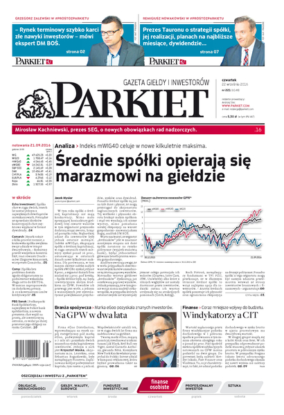 Największy w Polsce newsroom gospodarczy zbiera, analizuje i zgłębia dla Państwa najważniejsze informacje ze świata finansów. Codzienne wydanie „Parkietu”, sześć dni w tygodniu, to kilkadziesiąt artykułów o emitentach, instytucjach finansowych, gospodarce. To również opinie, felietony i wywiady z najważniejszymi ludźmi krajowej i globalnej finansjery.