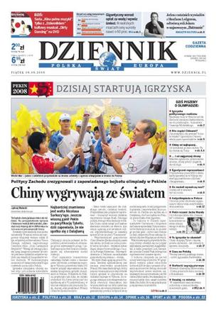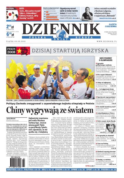 Dziś rozpoczynają się igrzyska w Pekinie; obrońcy praw człowieka organizują w całej Polsce demonstracje przeciw chińskiej propagandzie; PSL krytykuje Pawlaka za pochwałę nepotyzmu; na stronie internetowej rządu pojawił się komunikat o stanie zdrowia premiera; lekarze w szpitalach są zmuszani do pracy ponad siły; Francja zaprzecza oskarżeniom o ludobójstwo; wywiad z Agnieszką Radwańską; rozmowa z trenerem Wisły Kraków. Dodatki: The Wall Street Journal Polska, Warszawa, Kultura, Kultura TV.